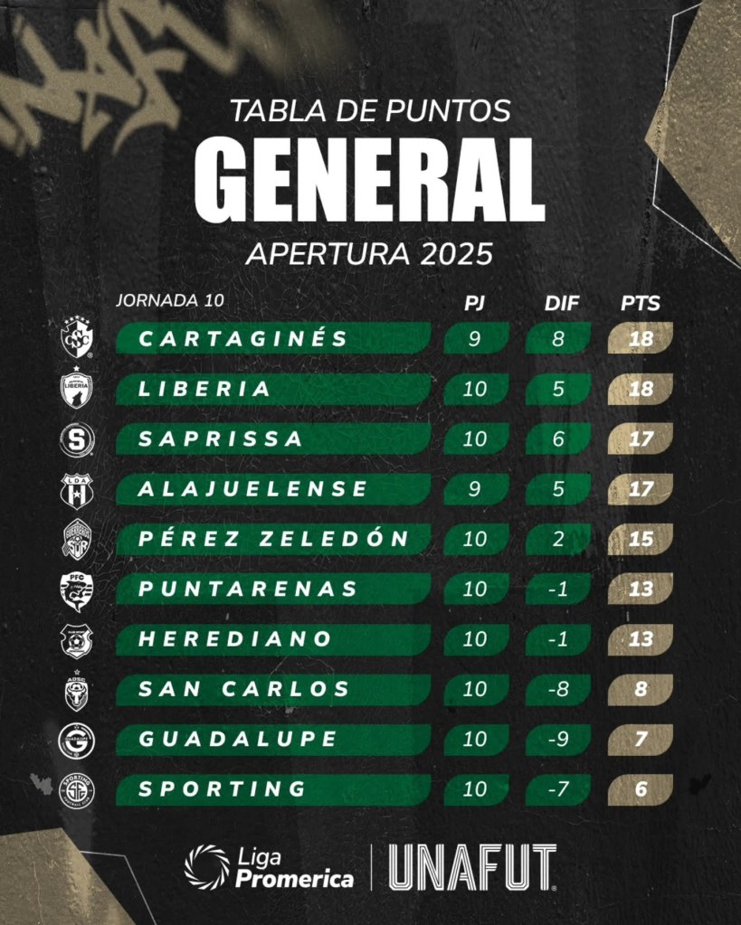 Asi queda la tabla general de puntos al finalizar la jornada 10 del torneo Apertura 2025 😱