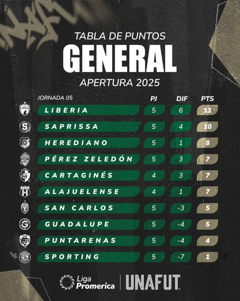 Municipal Liberia se mantiene líder invicto del Apertura 2025 tras la Jornada 5. 🐺